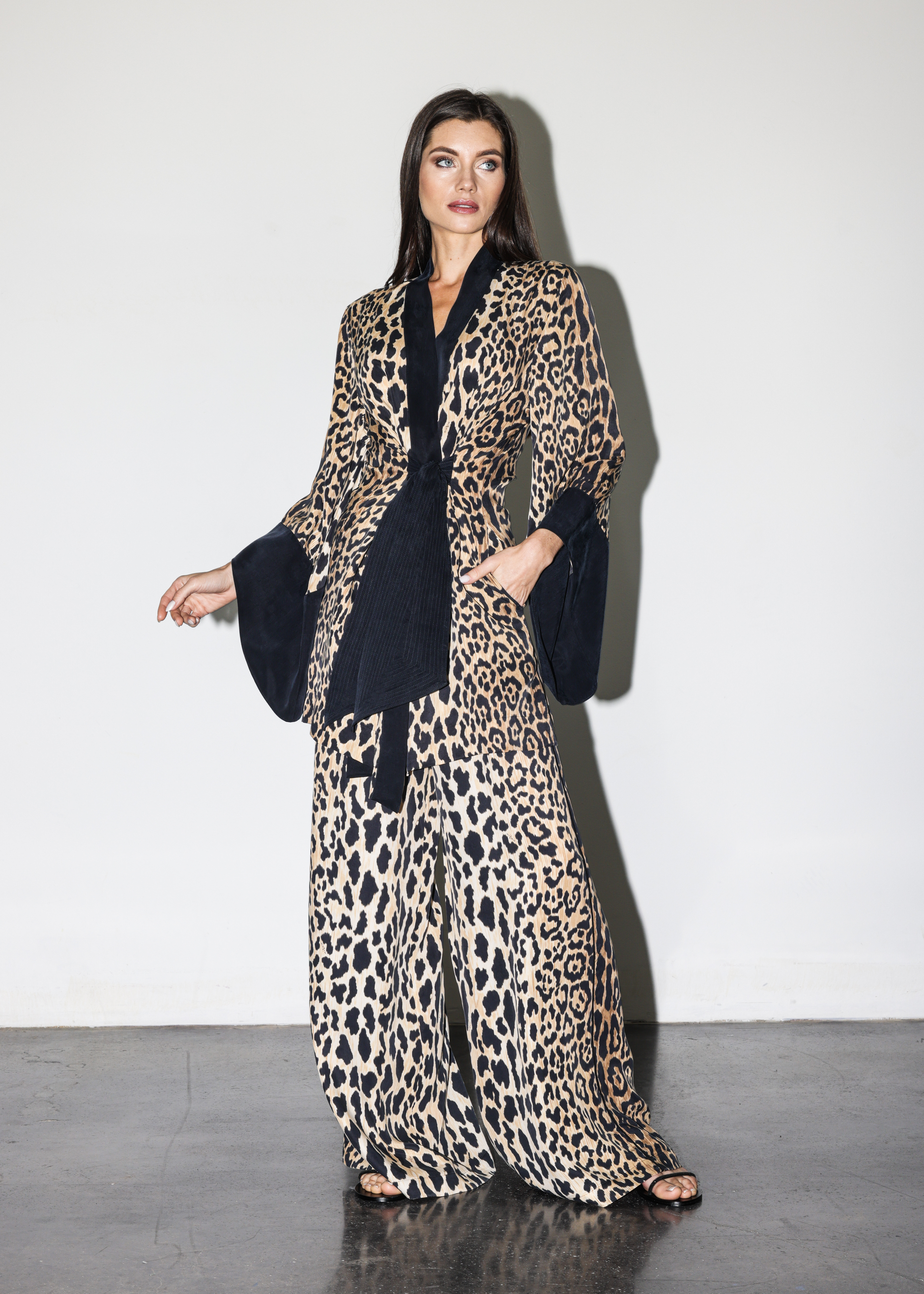 Loosely tailored with a wrap front silhouette, voluminous wide sleeves, and an attached belt for maximum ease. Our fresh take on the kimono is designed beautifully and comfortably fit every body with a midi-length finish.