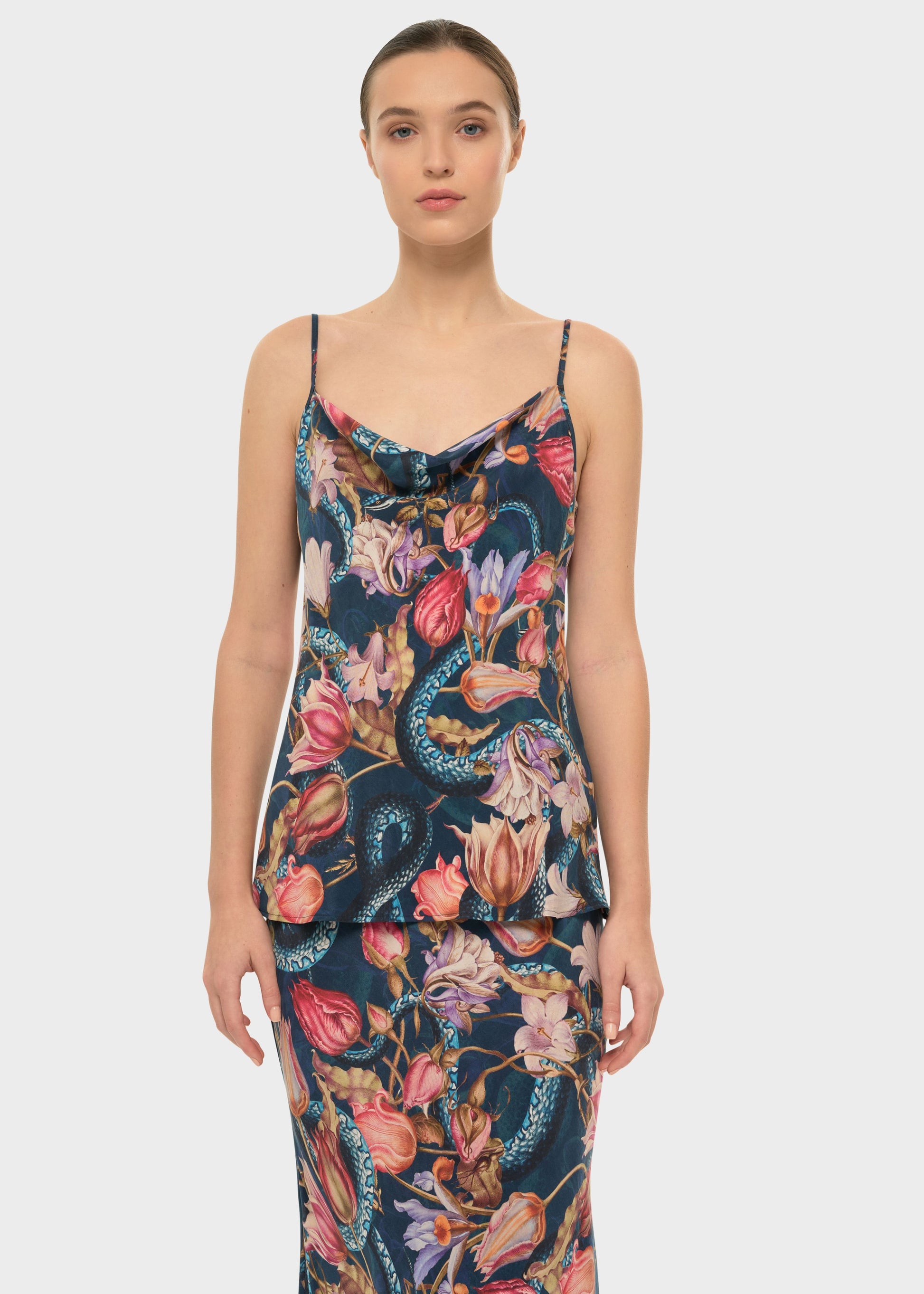 An everyday piece for confident and empowered women, the AquaFlora cowl cami top is crafted ethically in a timeless construction. Designed with a camisole cowl-neck silhouette, relaxed fit, and adjustable straps.