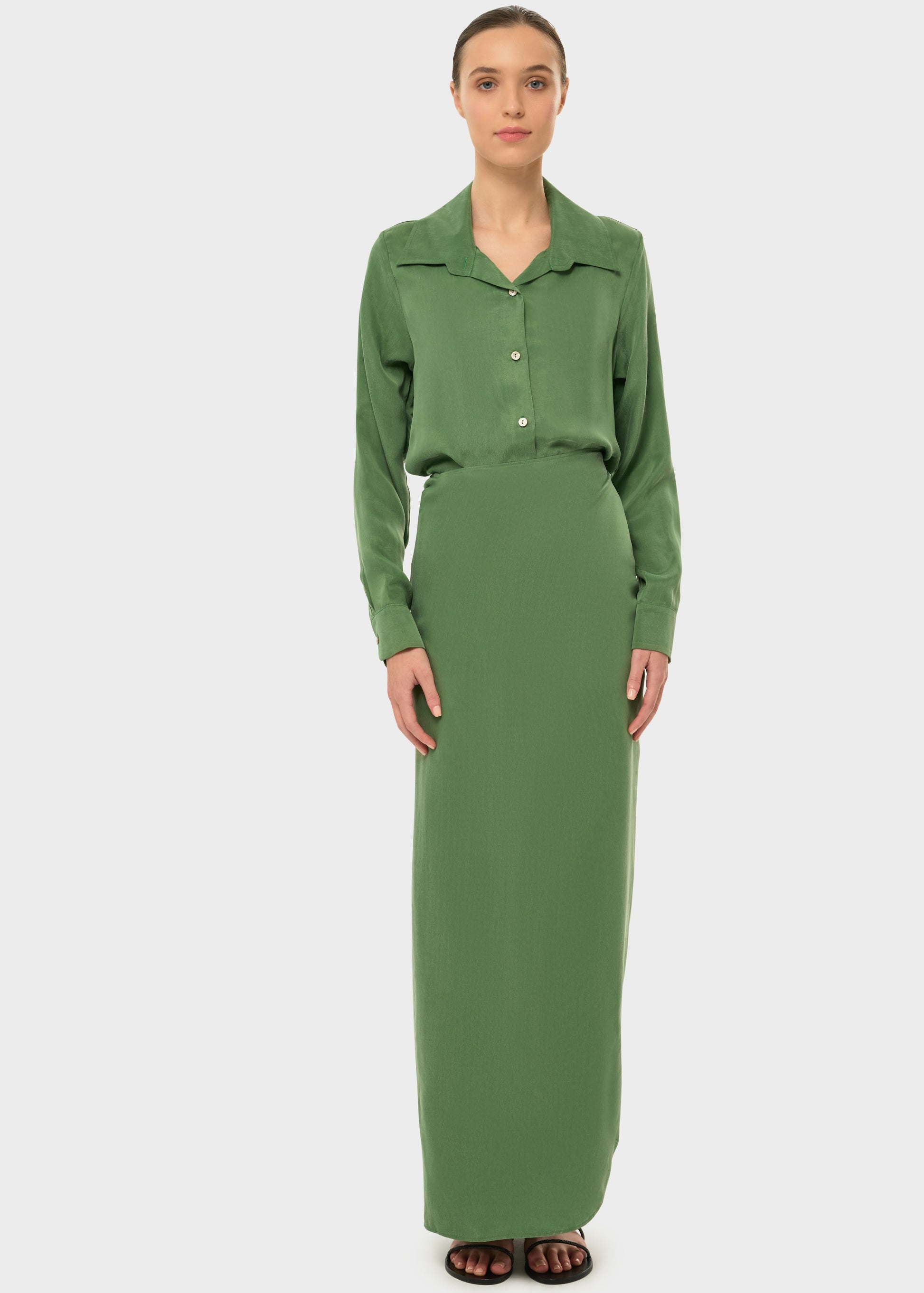 The Shirt Wrap Dress is a chic fusion of classic and contemporary style, perfect for the modern wardrobe. The top features a long-sleeve button-down design, offering a polished and timeless look, while the bottom transitions into a stylish tie-wrap skirt that adds a playful and feminine touch. The versatile top can be tucked into the skirt for a seamless silhouette or tied in the front for a more relaxed, casual vibe.