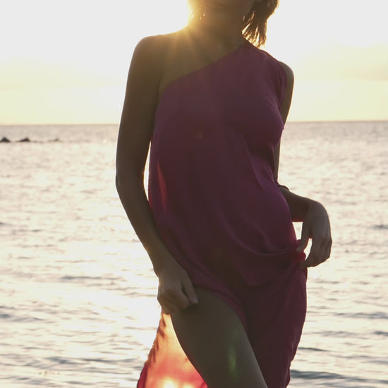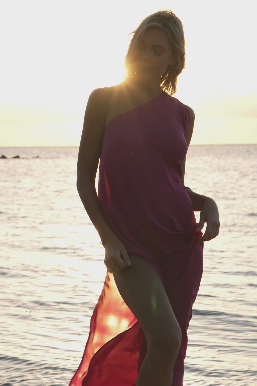 A captivating take on relaxed elegance, the Calypso one shoulder dress is crafted with mindful minimalism embracing your inner goddess. This asymmetric maxi has a long one-shouldered draped slit sleeve as well as an elegant side seam opening that reveals part of the leg.