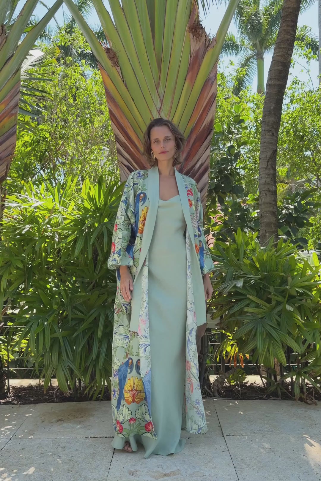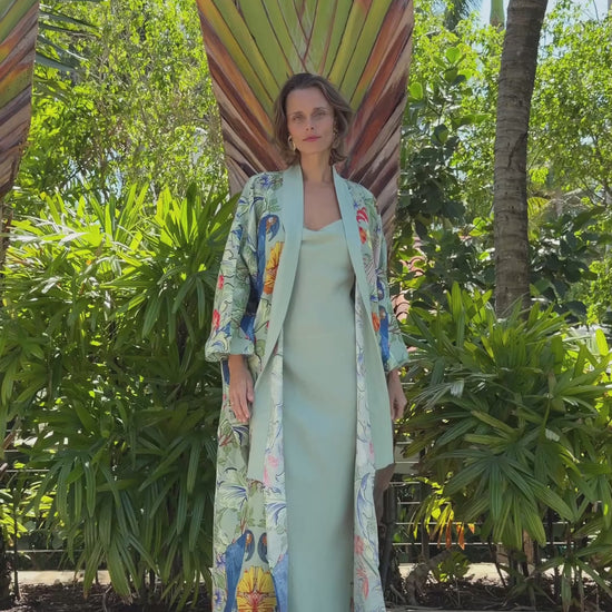 The kimono features voluminous sleeves inspired by traditional kimono design, along with a detachable reversible obi belt finished with a delicately stitched panel and two elegant tassels for a refined, elevated look. The vibrant Carmen print brings the piece to life with parrots and cockatoos set in a dreamlike tropical landscape, capturing the radiant spirit of summer.
