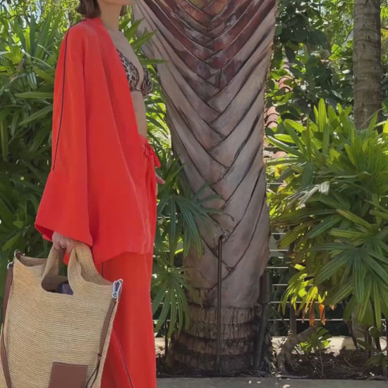The elegantly designed vegan silk wrap top is suitable for any occasion. Wear it to dinner with matching lounge pants for an elegant and sophisticated style. This top features flared sleeves, a detachable belt for the perfect fit, and sophisticated piping detail on the side seam and belt.