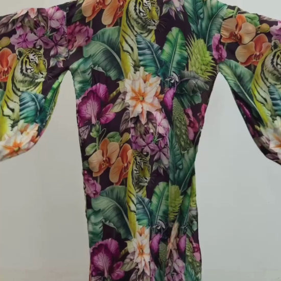 The kimono features a fluid, floor-length silhouette designed to drape beautifully on the body. The detachable, reversible obi belt allows you to cinch the waist for a more defined shape or wear it open for a relaxed, flowing look.