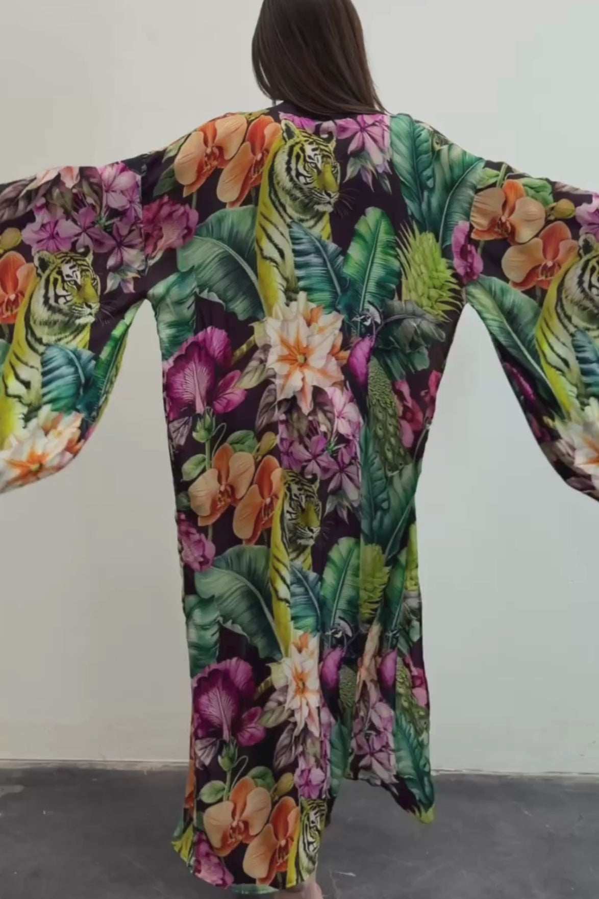 The niLuu vegan silk kimono comes in one size and will beautifully fit nearly all. For reference, length of kimono is 137cm/ 54" and model measurements are: