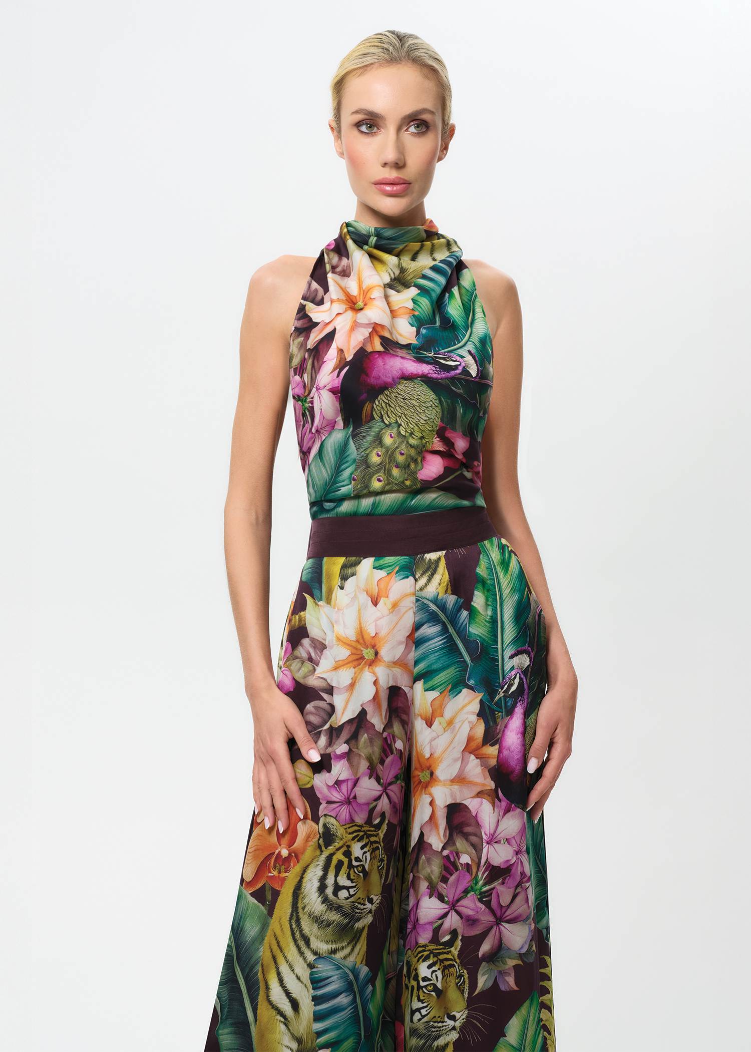 The Farrah Print, inspired by Farrah Fawcett’s wild beauty, is a unique jungle motif alive with tigers, peacocks, and lush jungle flora. Capturing the free-spirited glamour of the 1970s, Farrah embodies Calypso’s inspiration, a modern twist on St. Tropez in its golden age.