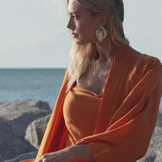 Experience effortless elegance with our modern take on the oriental kimono. The Anya Oriental Kimono features a fluid wrap front with voluminous sleeves that nod to traditional kimono design yet ensure a dramatic, timeless and modern silhouette. Its detachable, reversible obi belt is finished with a delicately stitched panel and accented with two silken tassels — details that elevate this piece with refined glamour. This floor-length kimono was designed with versatility in mind as the belt allows for a personalized fit. The kimono can be worn open for an effortless look or cinched for a more classic kimono style. Universally flattering and endlessly chic, the Anya Oriental Kimono pairs beautifully with the Scarlet Slip Dress as a statement ensemble or can be worn on its own as a symbol of modern sophistication.