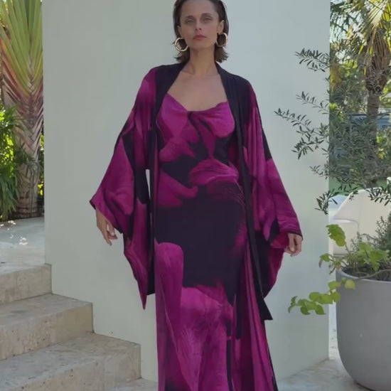 Naturally glamorous the Calypso Kaftan is a modern interpretation of wardrobe staple. The Calypso Kaftan features a voluminous yet figure-flattering silhouette, elevated with refined tapered cuff and slim floor length collar detailing as a touch of tailoring and sophistication. Designed with versatility in mind, it includes an interior tie at the waist that allows it to be worn open for an effortless drape and drama or closed for a demurer look. This floor-length piece transitions seamlessly from day-to-night and pairs beautifully with the matching Bralette and Lounge Lants as a sensual yet sophisticated full ensemble. Universally flattering and endlessly chic, the Calypso Kaftan embodies an effortless blend of comfort, luxury, and timeless style.