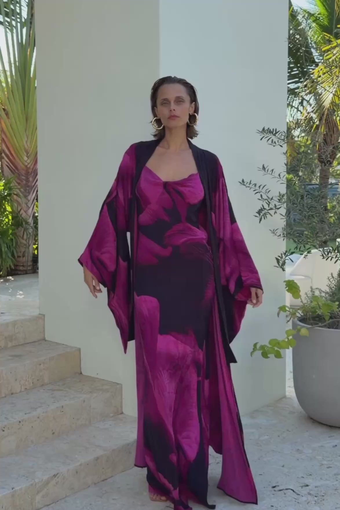 The niLuu vegan silk Kaftan comes in One Size, fit is oversized size. For reference, models measurements are:
