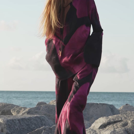 The Calypso Tunic Top pairs beautifully with matching lounge pants for a coordinated look, or with tailored trousers, or shorts for a more relaxed outfit.