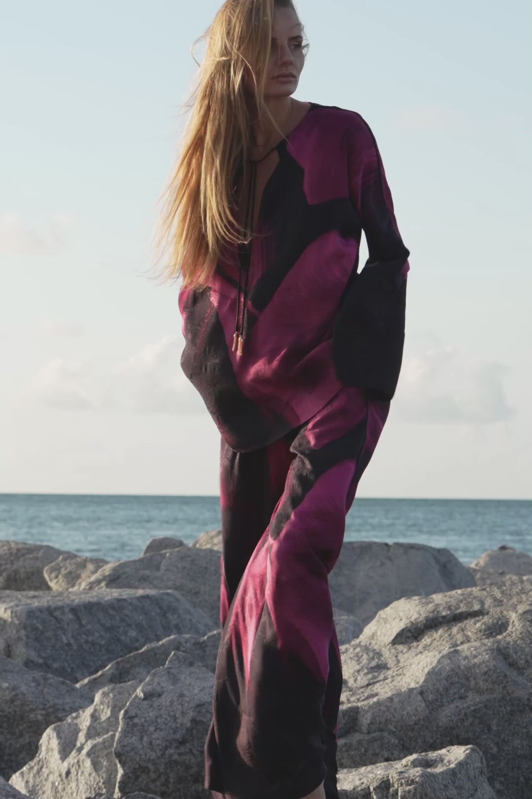 The Sophia Print, named after Sophia Loren, has all the allure of her iconic feminine wiles. The prints unique abstract strokes of fuchsia accentuate any figure by adding a touch of theatrical romance that captures the opulent yet playful essence of 1970s St. Tropez.