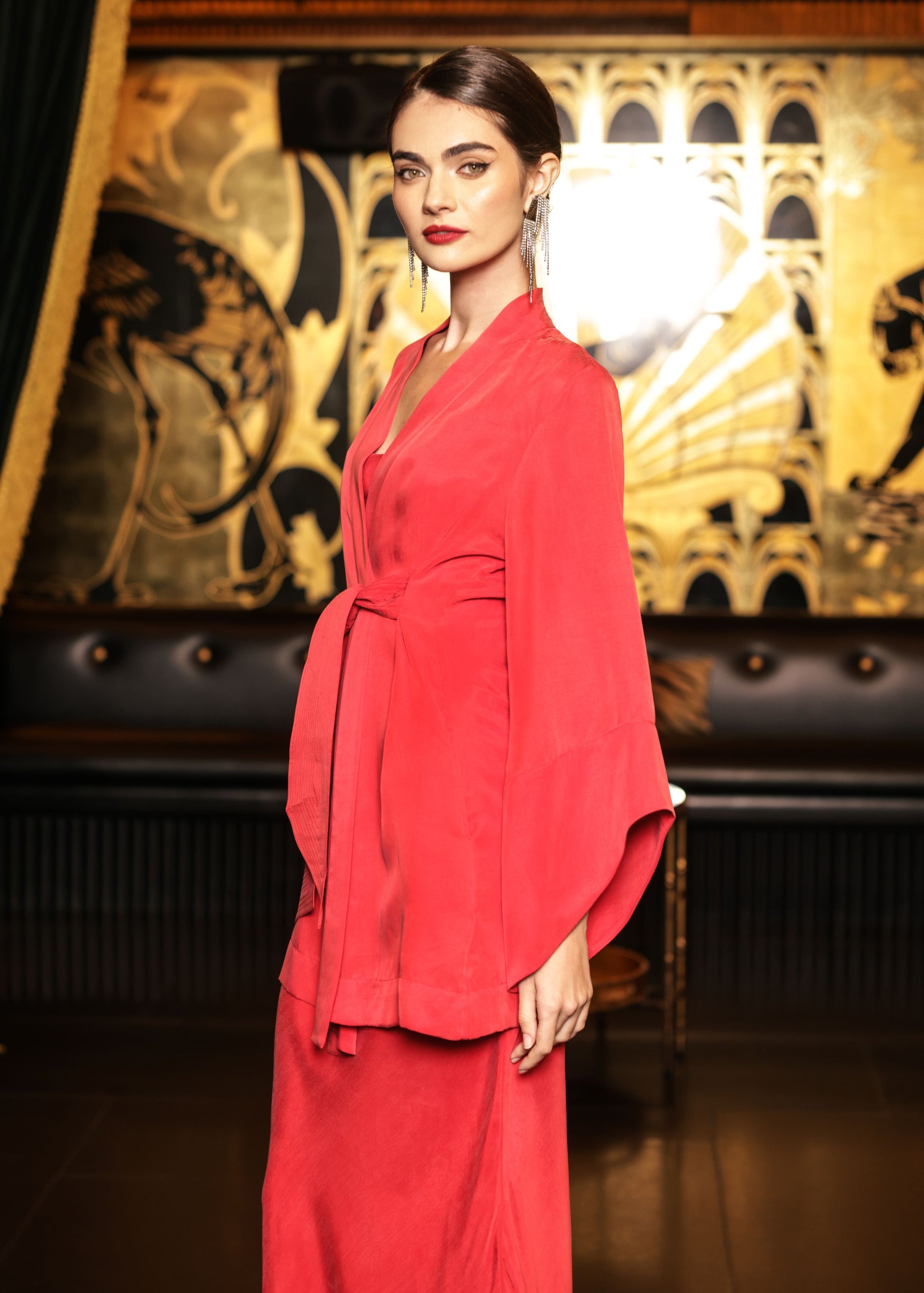 Loosely tailored with a wrap front silhouette, voluminous wide sleeves, and an attached belt for maximum ease. Our fresh take on the kimono is designed beautifully and comfortably fit every body with a midi length finish