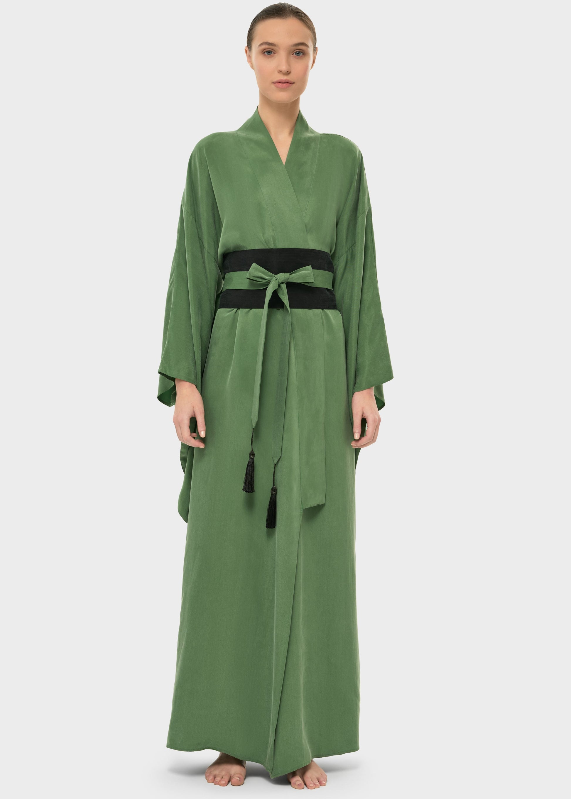 Experience effortless elegance with our modern interpretation of the oriental kimono. This kimono features a loosely tailored wrap front silhouette, complemented by voluminous wide sleeves for a dramatic yet comfortable look. The detachable belt allows for a customized fit, ensuring maximum ease and versatility. Designed to beautifully and comfortably accommodate every body type, this kimono-inspired robe boasts a full-length finish for a timeless, graceful appearance.