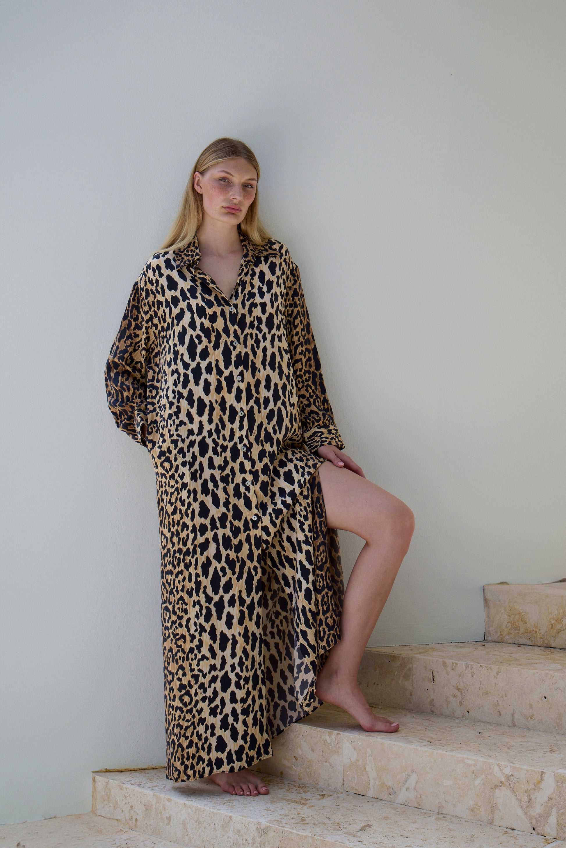 A modern take on the classic blouse designed with maximum ease into a maxi dress. The Calypso dress features a collared, button down silhouette.  Wear at home, or a night out styled with your favorite heel and a belt.
