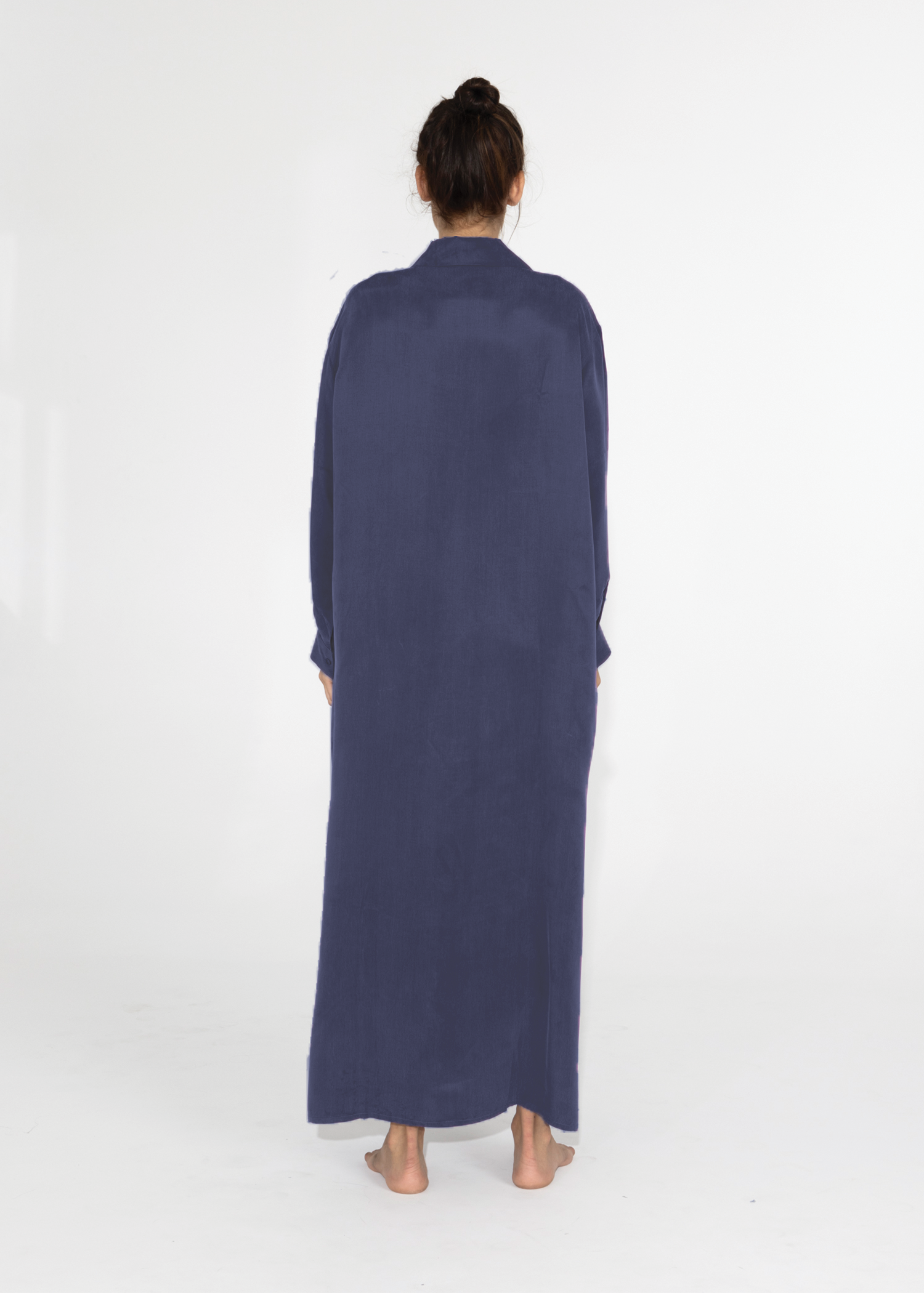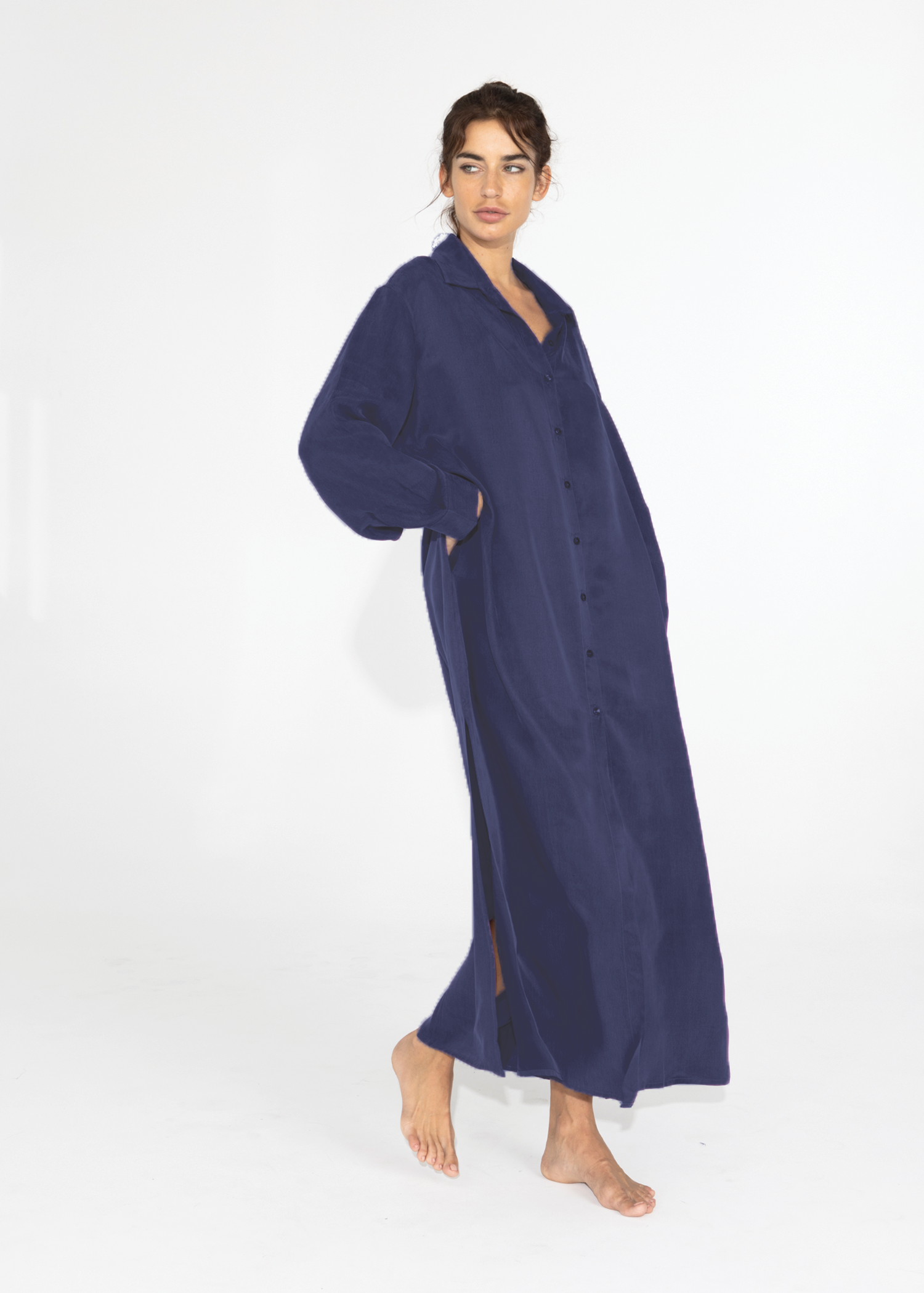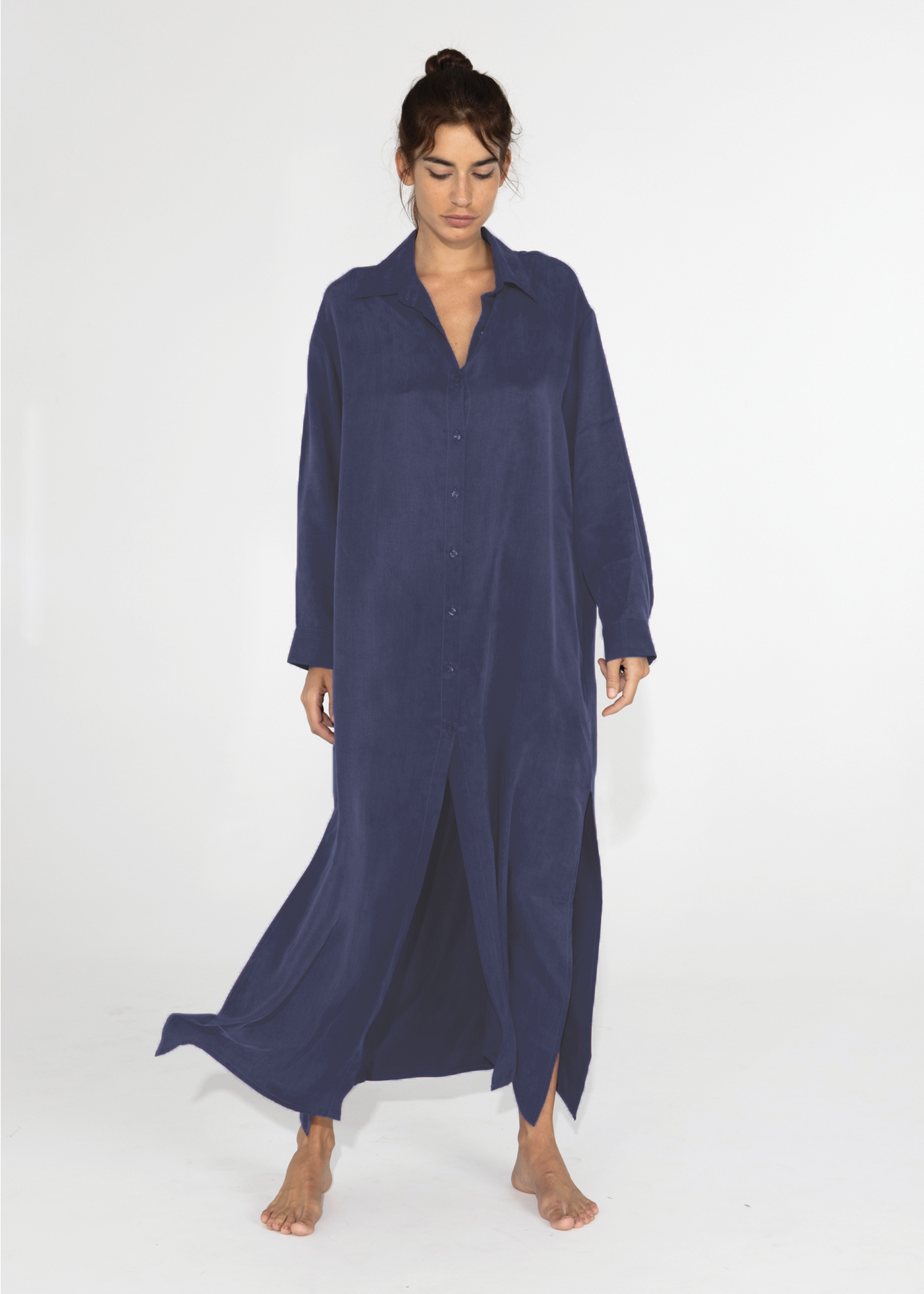 A modern take on the classic blouse designed with maximum ease into a maxi dress. The Calypso dress features a collared, button down silhouette.  Wear at home, or a night out styled with your favorite heel and a belt.