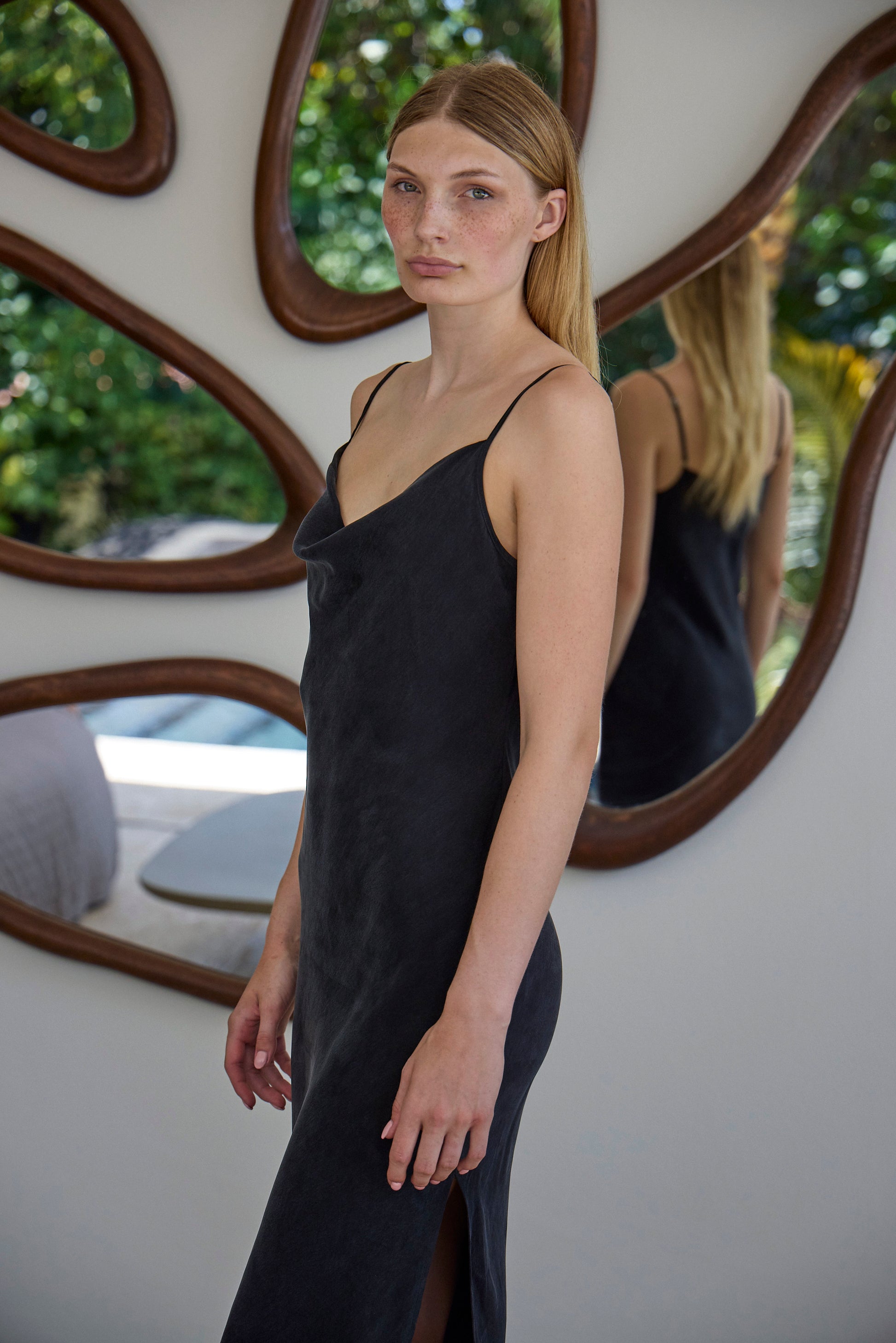 The perfect dress to slip into with its effortless elegance and timeless silhouette. The Charlotte features spaghetti straps, a low scooped cowl neck and for maximum appeal thigh high slits on either side.